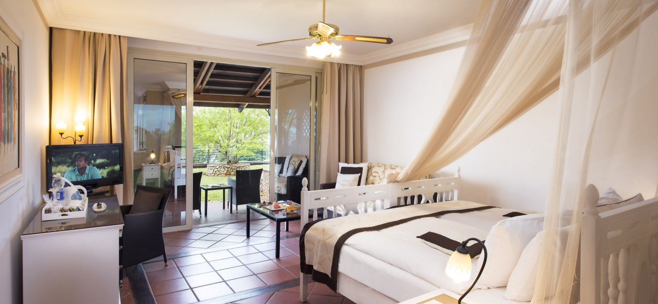 Junior Suite, con vista mare, terrazza privata e accesso diretto al giardino. Servizi interni indentici alle double room.
